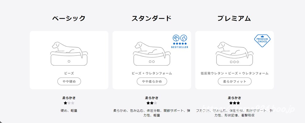 | 充填 | ベーシック(プレミアムビーズ)・スタンダード(ビーズ + ウレタンフォーム)・プレミアム(低反発ウレタン + ビーズ+ ウレタンフォーム) |