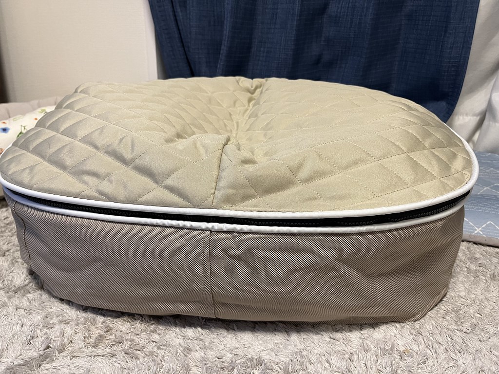 ホントに中に空気が入っているような感じの座面です。わんちゃんが横になった時の体の線に合うようになっているのでしょう。だからといってずっしりと深く沈みこんでしまう感じもありません。
