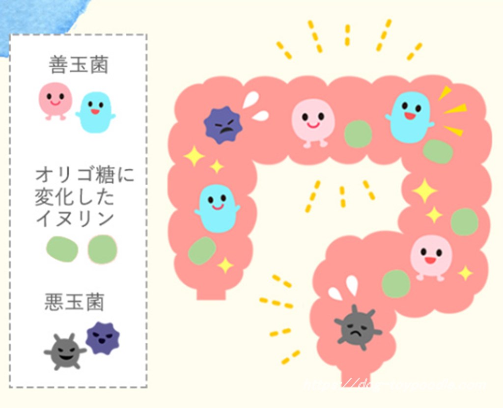 イヌリンは主に大腸にいるビフィズス菌などの善玉菌のエサとなります。