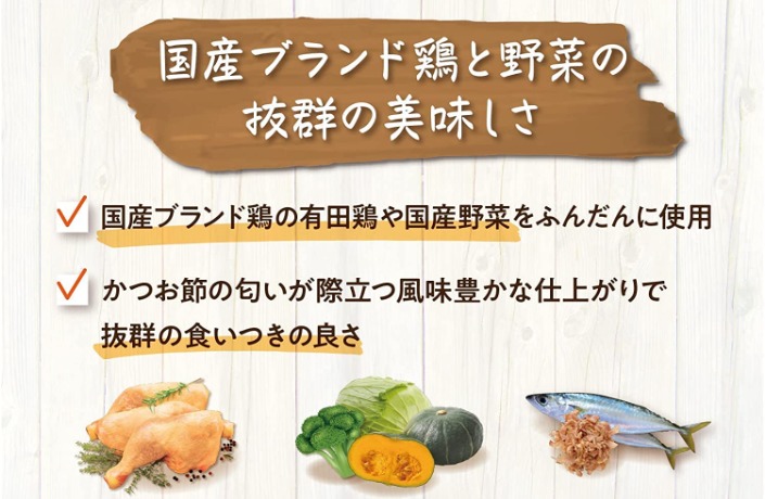| 原材料 | 鶏肉、大麦、玄米、大麦ぬか、鰹節、甜菜繊維、ビール酵母、卵黄粉末、MCT(中鎖脂肪酸油)、黒米、赤米、イヌリン(水溶性食物繊維)、コラーゲンペプチド、発酵調味液、玄米麹、はと麦、あわ、きび、ひえ、フラクトオリゴ糖、大根葉、昆布、ごぼう、人参、コンドロイチン、N-アセチルグルコサミン、乳酸菌、DHA含有精製魚油粉末、キャベツ、ブロッコリー、かぼちゃ、紫いも、さつまいも、あかもく、わかめ、マリーゴールド粉末、セレン酵母、白菜、高菜、パセリ、青じそ、タウリン、ミネラル類(卵殻カルシウム、塩化カリウム、グルコン酸亜鉛、ピロリン酸第二鉄、グルコン酸銅)、ビタミン類(ビタミンA、ビタミンD、ビタミンE、ビタミンB2、ビタミンB12、パントテン酸カルシウム)、酸化防止剤(ローズマリー抽出物、ミックストコフェロール) |