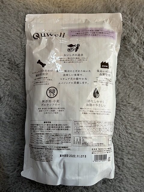 また、キュエル(Quwell)は、1㎏だけの販売です。わんちゃんには、常に新鮮なフードを…。という思いより1㎏のみでの販売となってます。